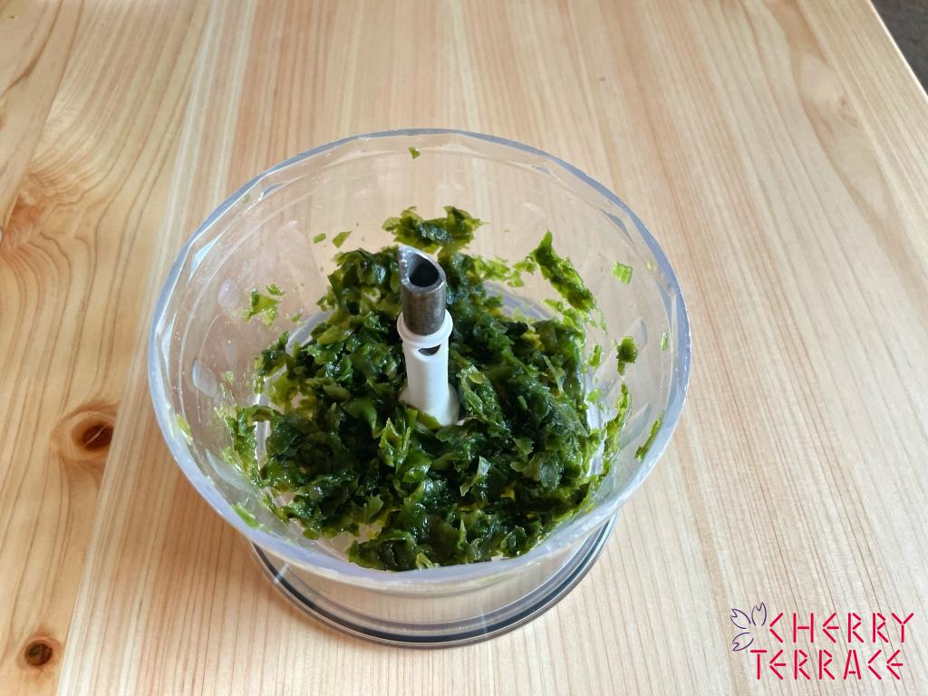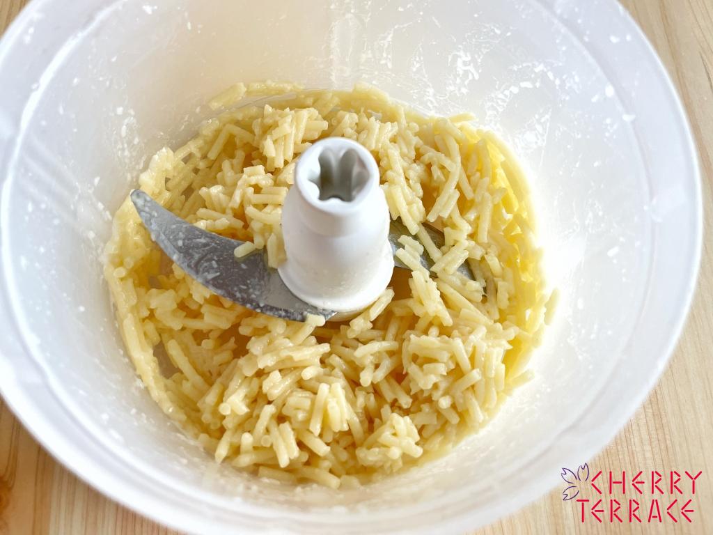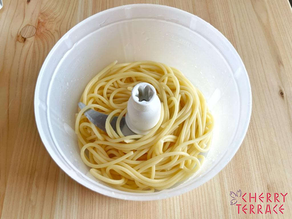 そのままだとデンプンの粘りが出てしまうので、水で軽く洗い、バーミックス(スライシー/チョッピングナイフ)で1、2cmくらいになるまで切り混ぜます。