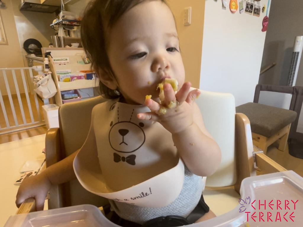 離乳食に関しては、以前よりも少しは硬いものも食べられるようになり、量もだいぶ増えました。