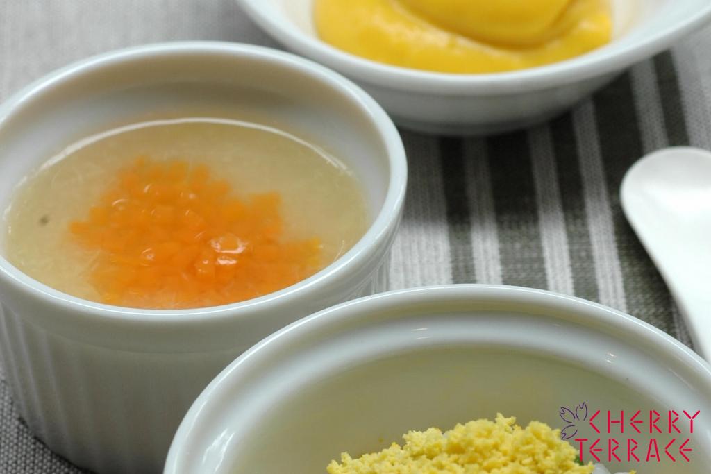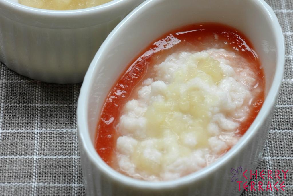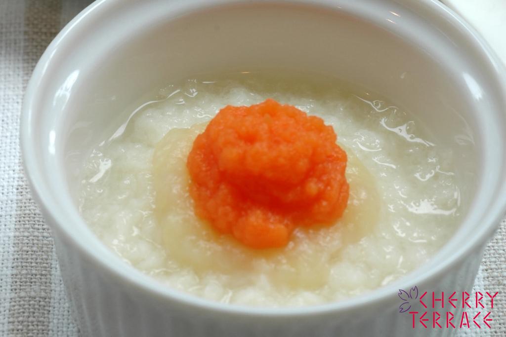 野菜スープパンがゆのにんじん、きゃべつ、玉ねぎのピュレ添え
