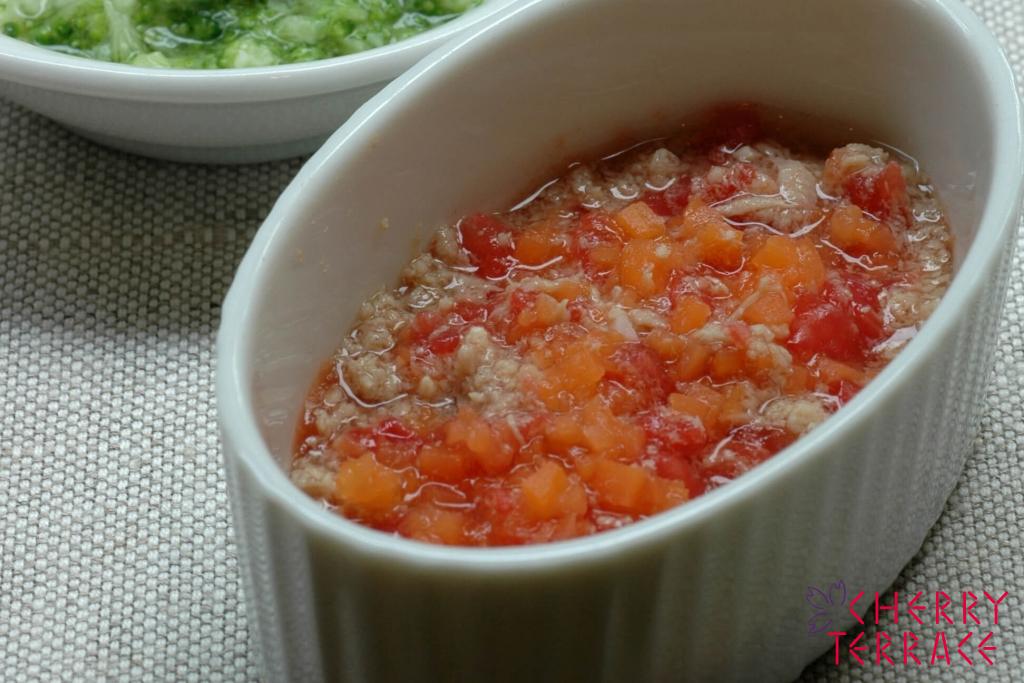 - マグロのほぐし身と、ゆでにんじんのみじん切り、湯むきトマトのみじん切り、トマトソースをあわせる。