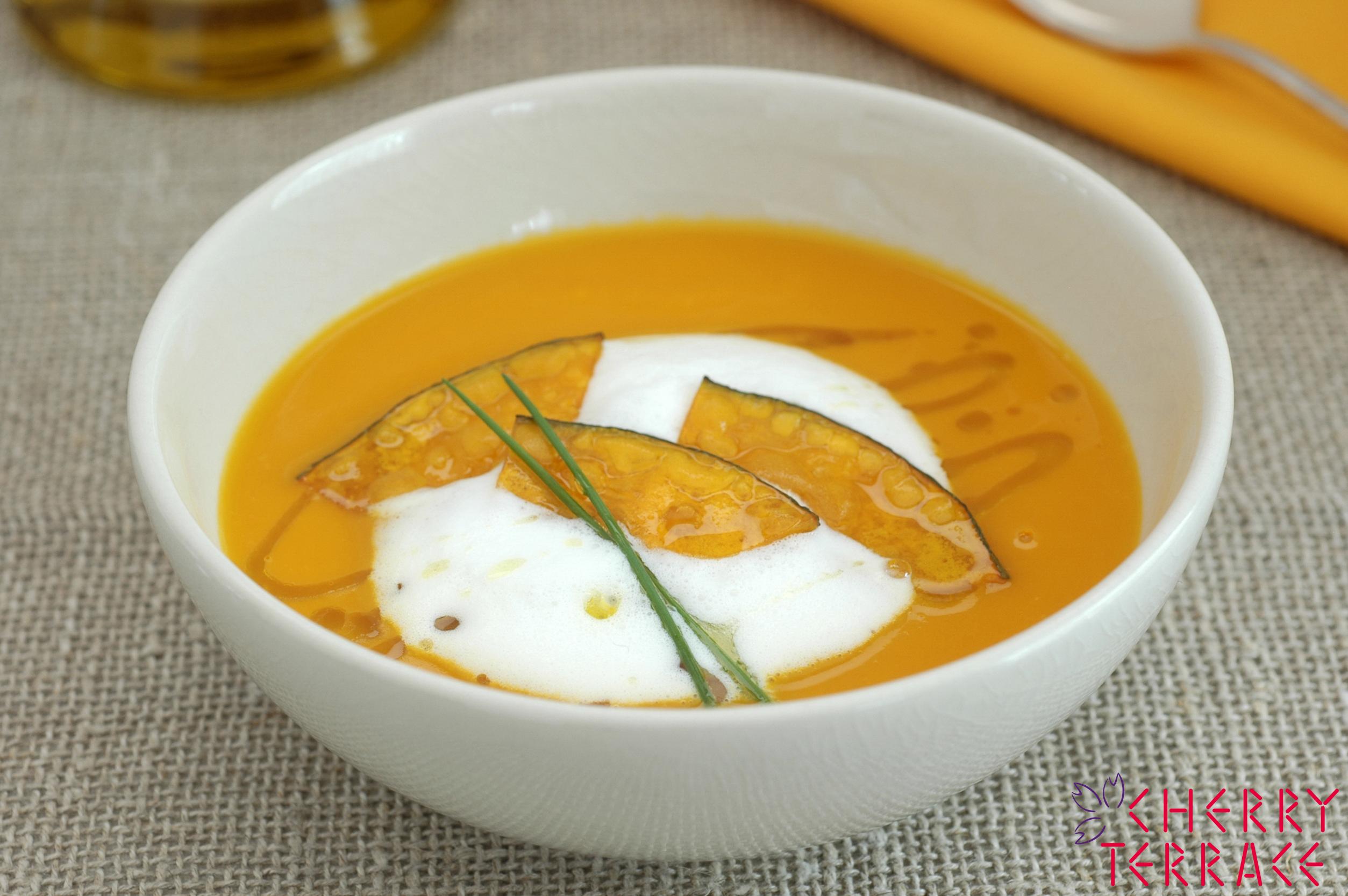 - 牛乳の半量を耐熱容器に入れて温め、バーミックス(ビーター)で温める。4にのせ、薄切りして素揚げしたかぼちゃ、シブレットを添え、好みでラウデミオ(EXV.オリーブオイル)をふる。