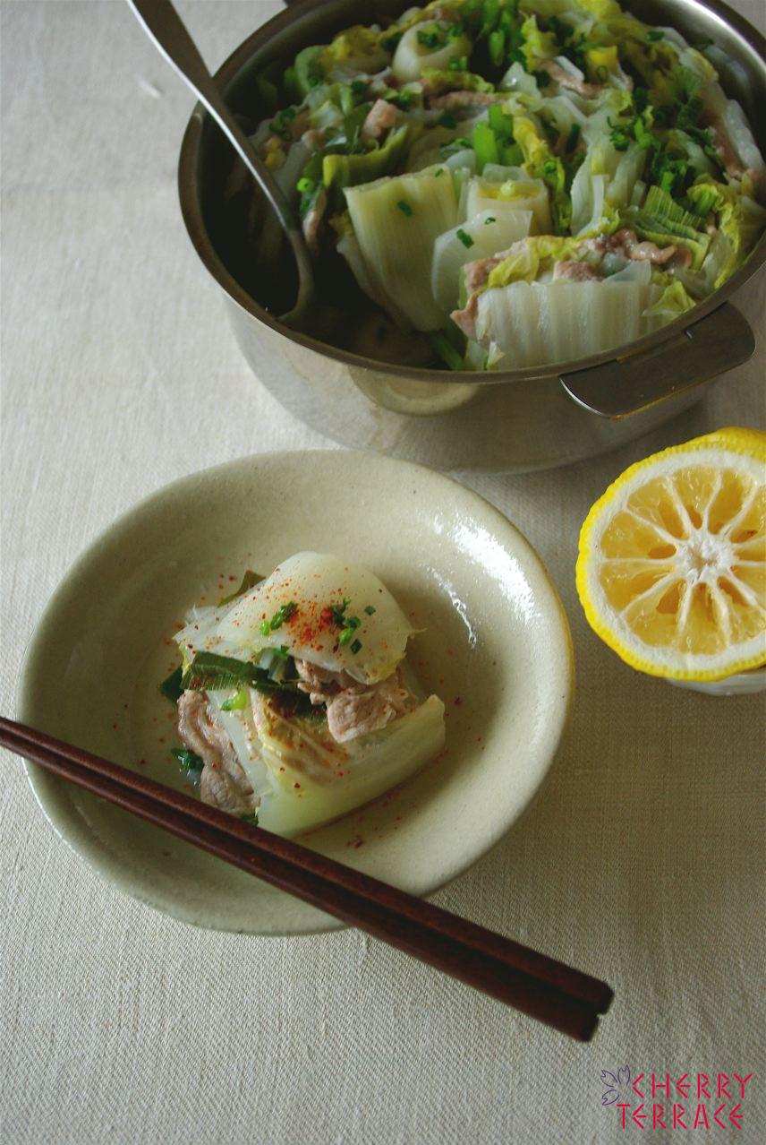 - 具材を鍋にしっかりと詰めたら、塩と日本酒をそれぞれ振りかける。最後に水80mlをまわしかけて蓋をし、中火にかける。煮立ってきたらすこし火を弱めて15分ほど煮、材料がやわらかく煮えたら出来上がり。あさつきを散らす。取り分けて、好みで味付けをする。