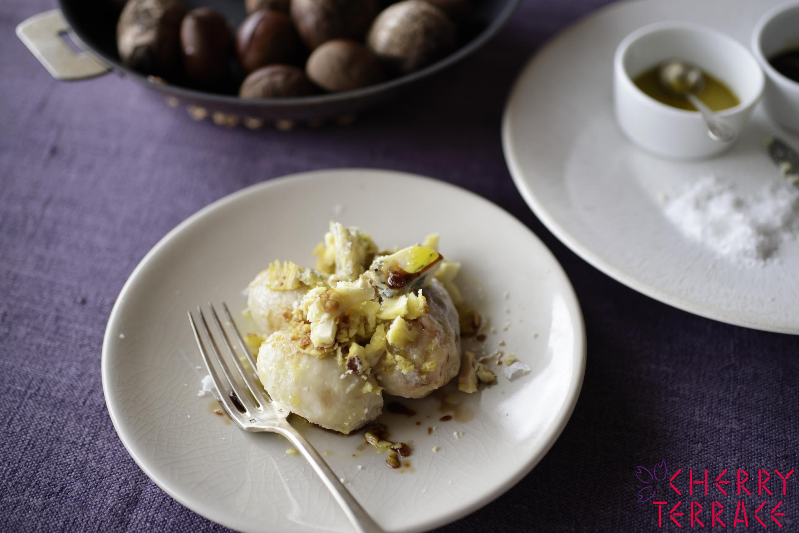(手間はかけずに)時間をかけてゆっくりオーブンで焼き上げた里芋と栗。見るからに食欲をそそる一品です。ラウデミオ、粗塩で味付けすると、その素朴なおいしさをじっくり味わうことができますし、ブルーチーズとの組み合わせも絶妙です。