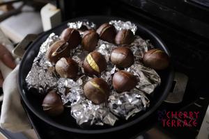 - 鍋にたっぷりお湯を沸かす。栗は洗って沸騰したお湯に入れ、蓋をし火を止めて30分ほどおく。栗の平らな面に横に一本浅めに切り込みを入れる。里芋を焼き始めて40~50分したら金串か小さいナイフを刺してみて、やや固めに火が通ったら里芋の上に栗を乗せる。