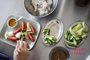 - きゅうりは両端を切り、ピーラーで筋状に皮をむいてから斜めに厚切りする。セロリは筋を取り、きゅうりと同様に斜め切り。トマトは食べやすくくし形に切り分ける。きゅうりとセロリをボウルに入れ、ごく少量の塩を振って混ぜる。器に盛り、香菜を添え、2のドレッシングをかける。