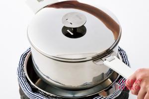 - ホットキルトにクリステル深鍋24cmをセットしておき、2を火からおろしたらすぐにふたを開けずに24cmの鍋の中に重ねる。素早くカバーを被せる。