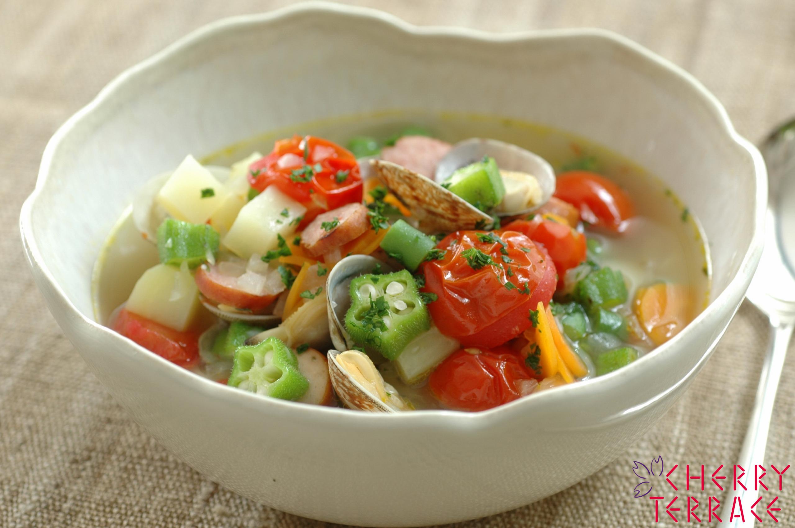 - 1の煮汁といんげん、オクラ、プチトマトを加え、さらに煮る。塩、こしょうで味を調え、1のあさりの身を加える。