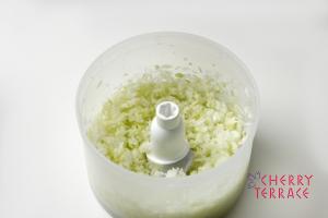 - キャベツはバーミックス(スライシー/チョッピングナイフ)で粗みじん切りにし、ボウルに移す。塩小さじ1を加えてもみ、水気をかたく絞る。