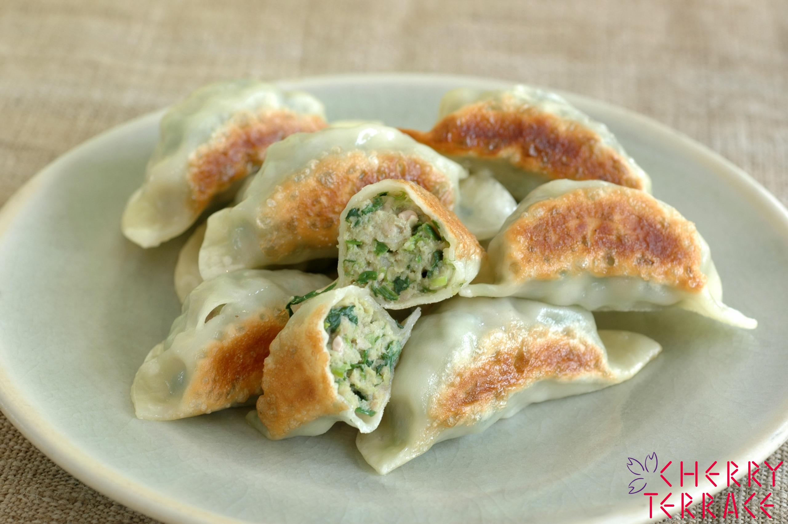 - クリステルフライパンを中火で熱してごま油をひき、ぎょうざを並べ、焼き色が底についたら、水1/2カップを注ぎ入れて蓋をする。水分が飛んできたら蓋をとり、最後にごま油少々を加え、焼き上げる。
