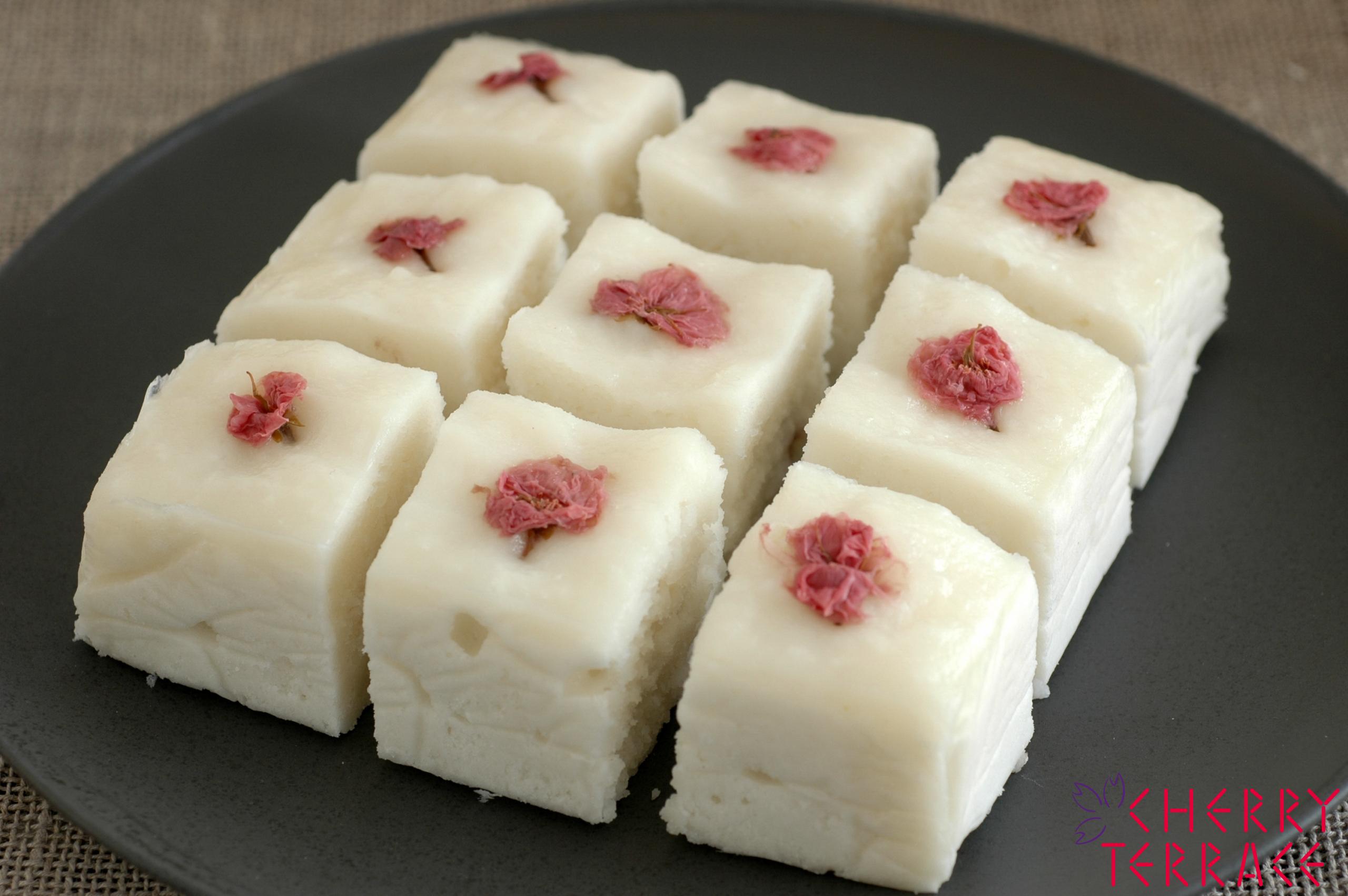- 1の型の中に流し入れる。桜の塩漬けを均等にのせる。