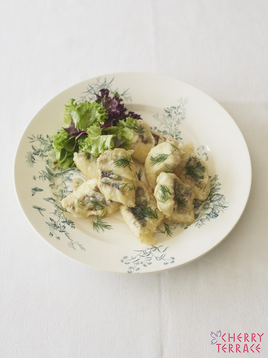 添えたハーブサラダにもたっぷりとレゼルヴァをかけてお召し上がりください。お好みで直前にもう一度かけても、香りが立ちます。衣がふわふわの白身魚のフリットに、レゼルヴァをたっぷりかけました。