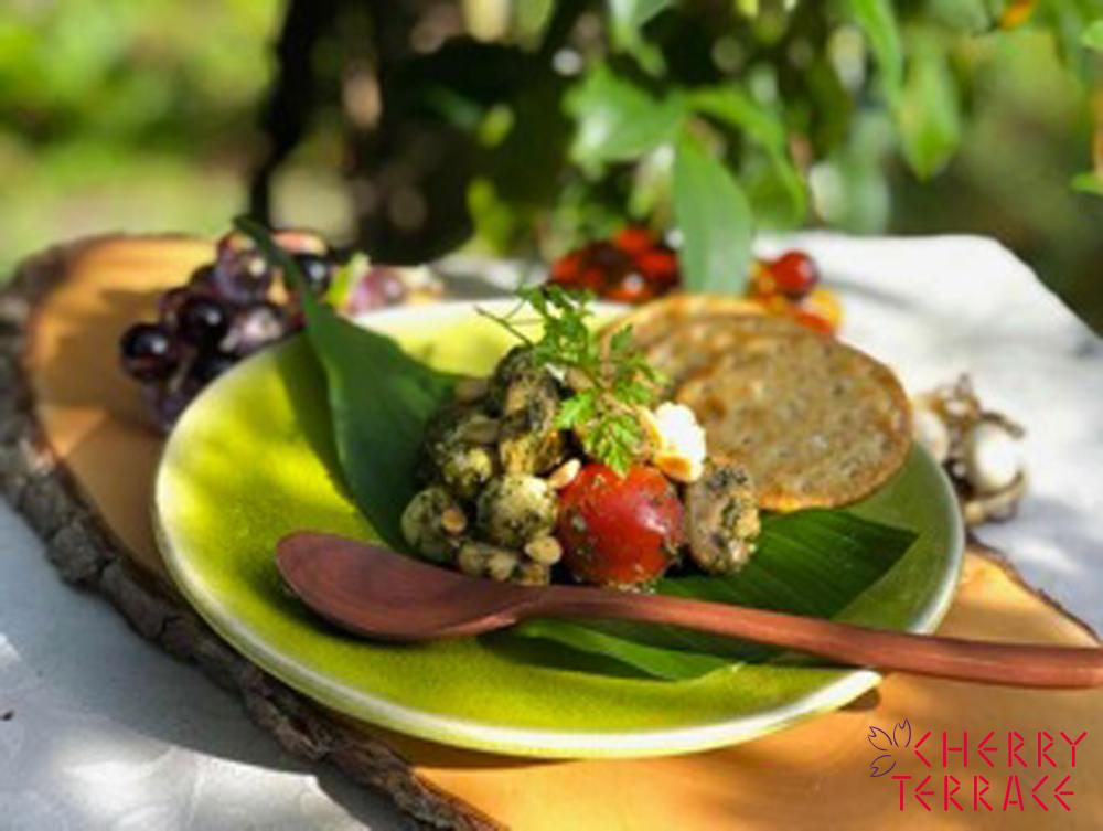 - モッツァレッラ、トマト、オリーブオイルでさっと炒めて塩胡椒し冷ましたマッシュルーム、松の実を、青紫蘇ジェノヴェーゼで和える。