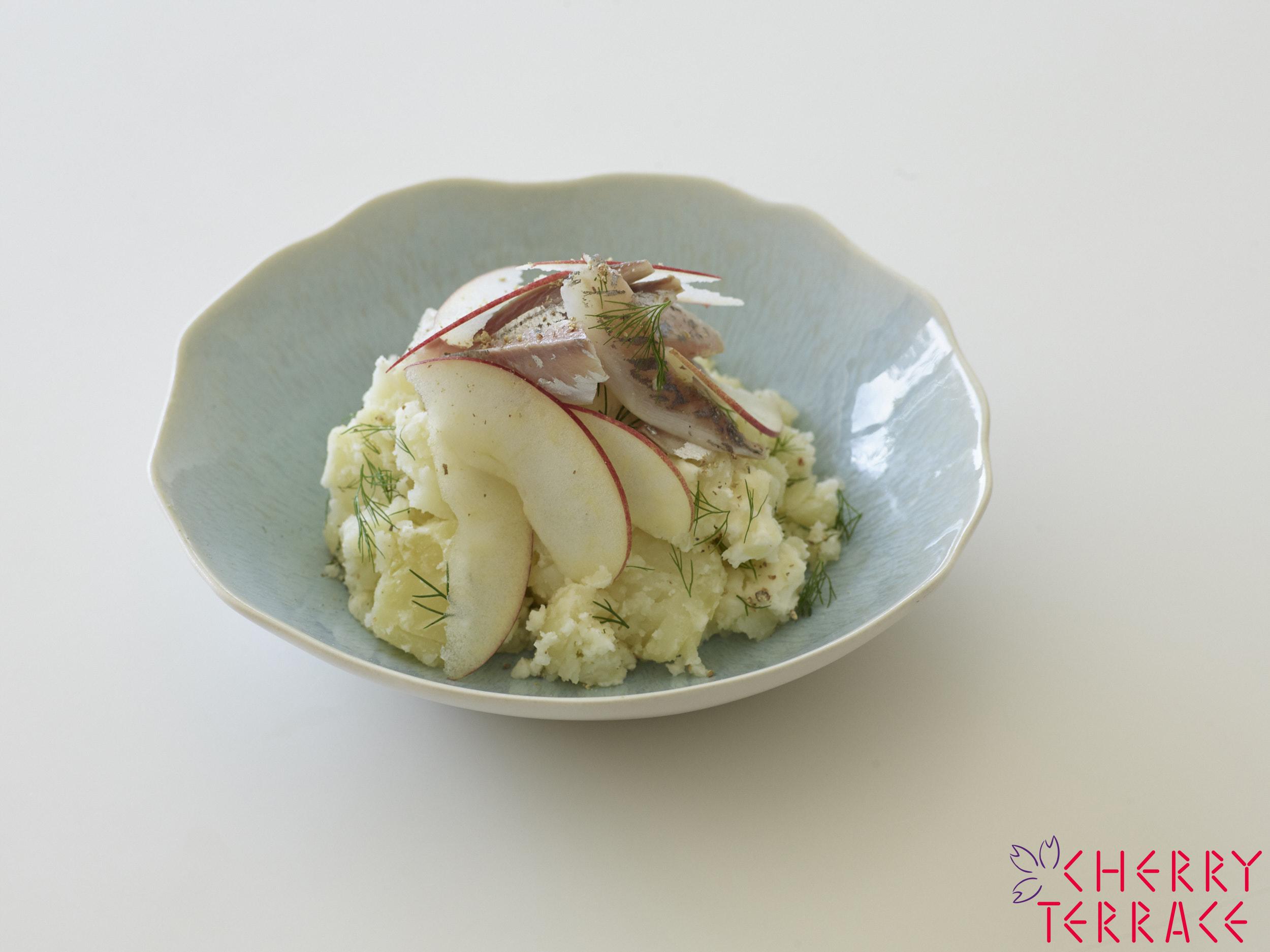 - 茹で上がったじゃがいもは熱いうちに皮をむき、ボウルに入れて粗めにつぶし、ビアンコをまわしかけ、サワークリームを加え、粗塩、ディルの葉を混ぜる。