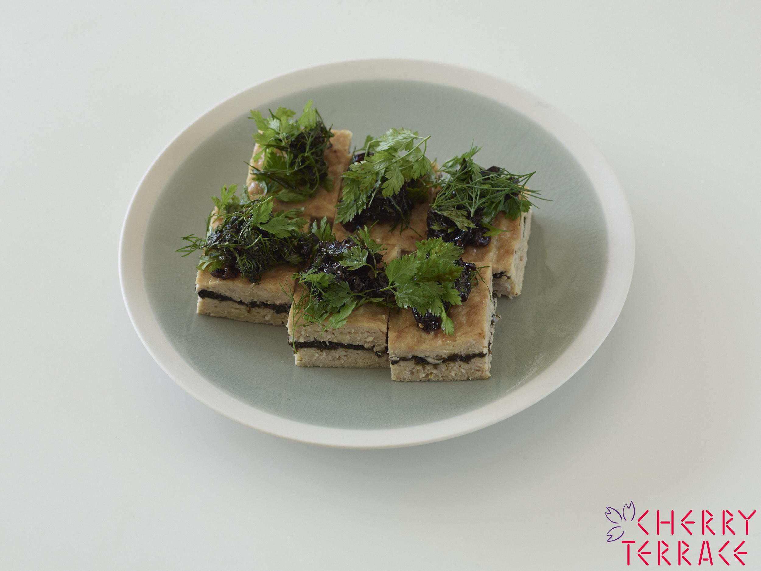 - 焼きあがった2の粗熱が取れたら、12等分に切り分け、上に3をのせ、残しておいたハーブ類をのせる。