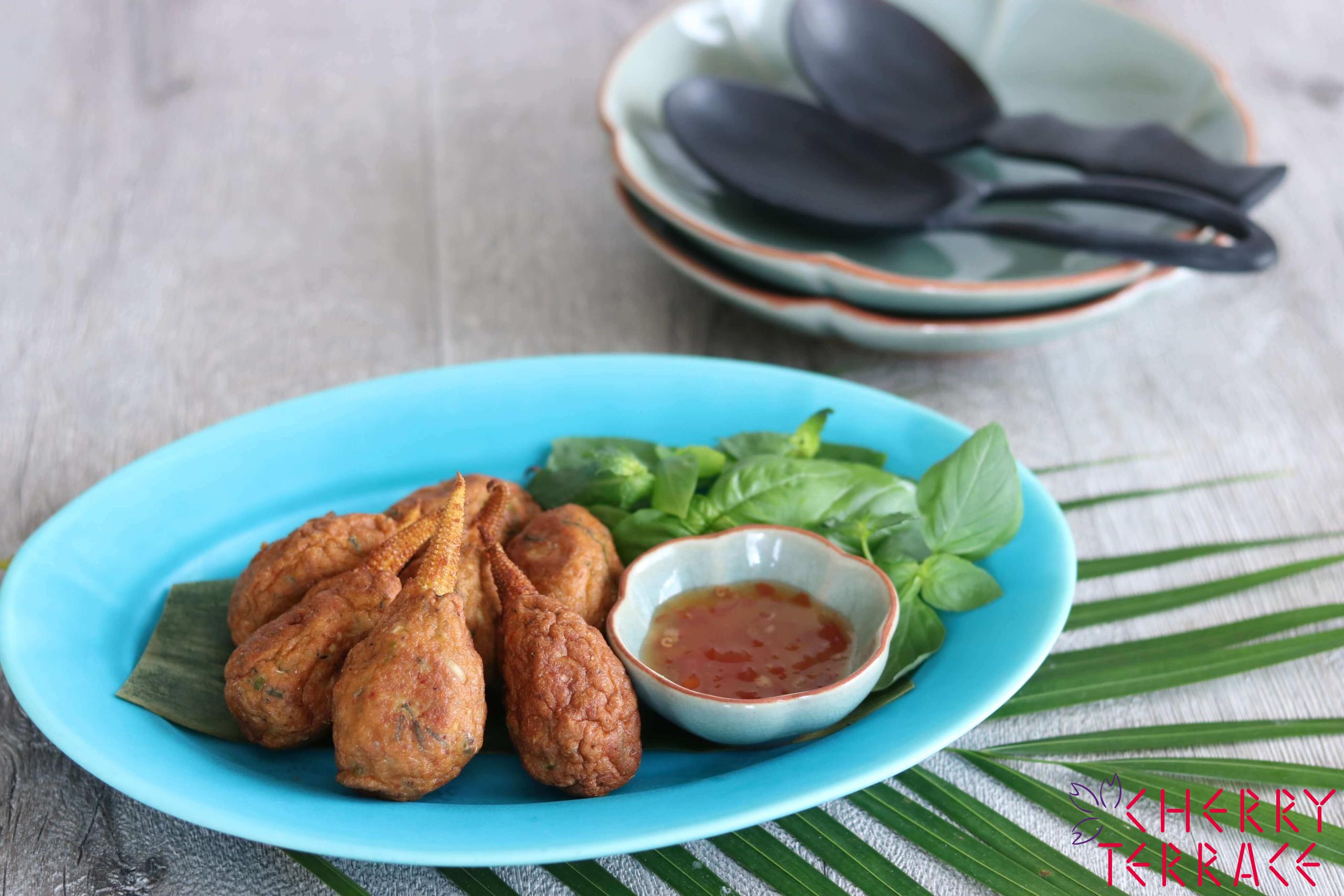 - 2にレモングラス・こぶみかんの葉・青唐辛子のスライスを入れて混ぜ、8等分にする。中心にベビーコーンを入れて先が出るように丸め、クリステル深鍋にクッキングバスケットをセットし、170度の油で揚げる。