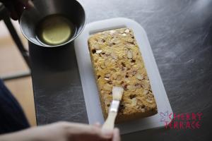 - 程よく焼き色がついたら竹串を刺して、生地がついて来なければ焼き上がり。型から外し、蜂蜜と水を同量合わせて刷毛で表面に塗る。冷めたらラップなどで包んで保存。