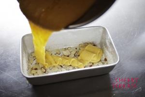 - 型にラウデミオを刷毛で薄くぬり、コーンフラワーを茶こしでふるう(よけいな粉は払っておく)。型の底の部分にスライスアーモンドを散らす。オーブンを170度に温める。