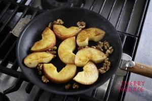 - りんごは洗って2等分し、横に4、5等分に厚めに切り分けてからナイフで切り込みを入れて芯を外す。クリステルフライパンにラウデミオを温め、りんごを並べ入れる。中火で動かさずに焼き、途中で空いている部分にくるみを散らす。下側にこんがりと焼き色がついたら上下を返し、同様に焼く。くるみは強めに焦げ目がつくように様子を見ながら。