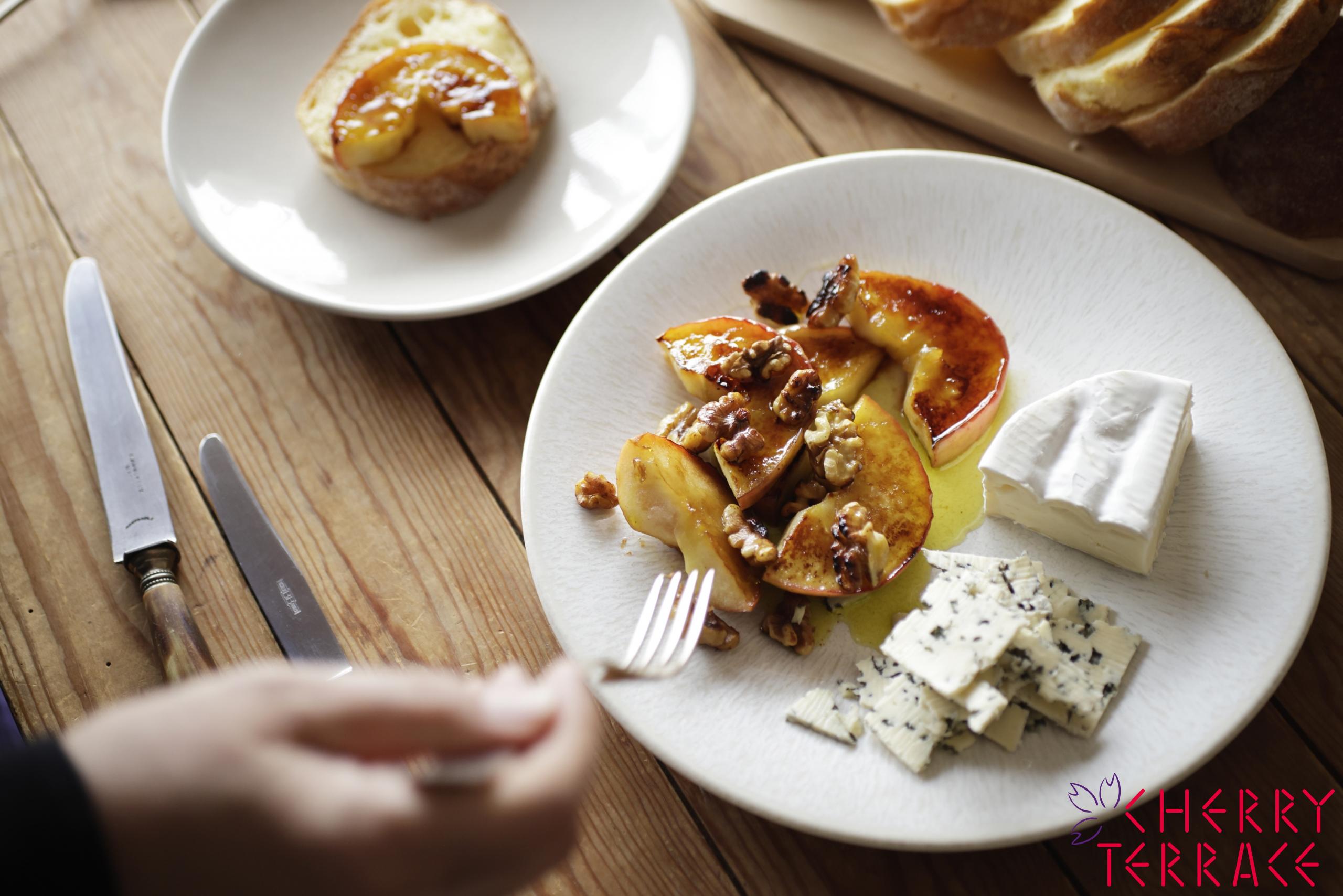 - 大きめの器にりんごとくるみを盛り、カマンベールとブルーチーズを盛り合わせる。りんごにラッコルトをまわしかける。