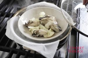 - 牡蠣がふっくらとしたら蒸しあがり。できるだけ蒸しあがりの温かいうちに食卓へ。すぐにラッコルトをまわしかけ、そのままかまたは好みでこしょうを引きかけても。