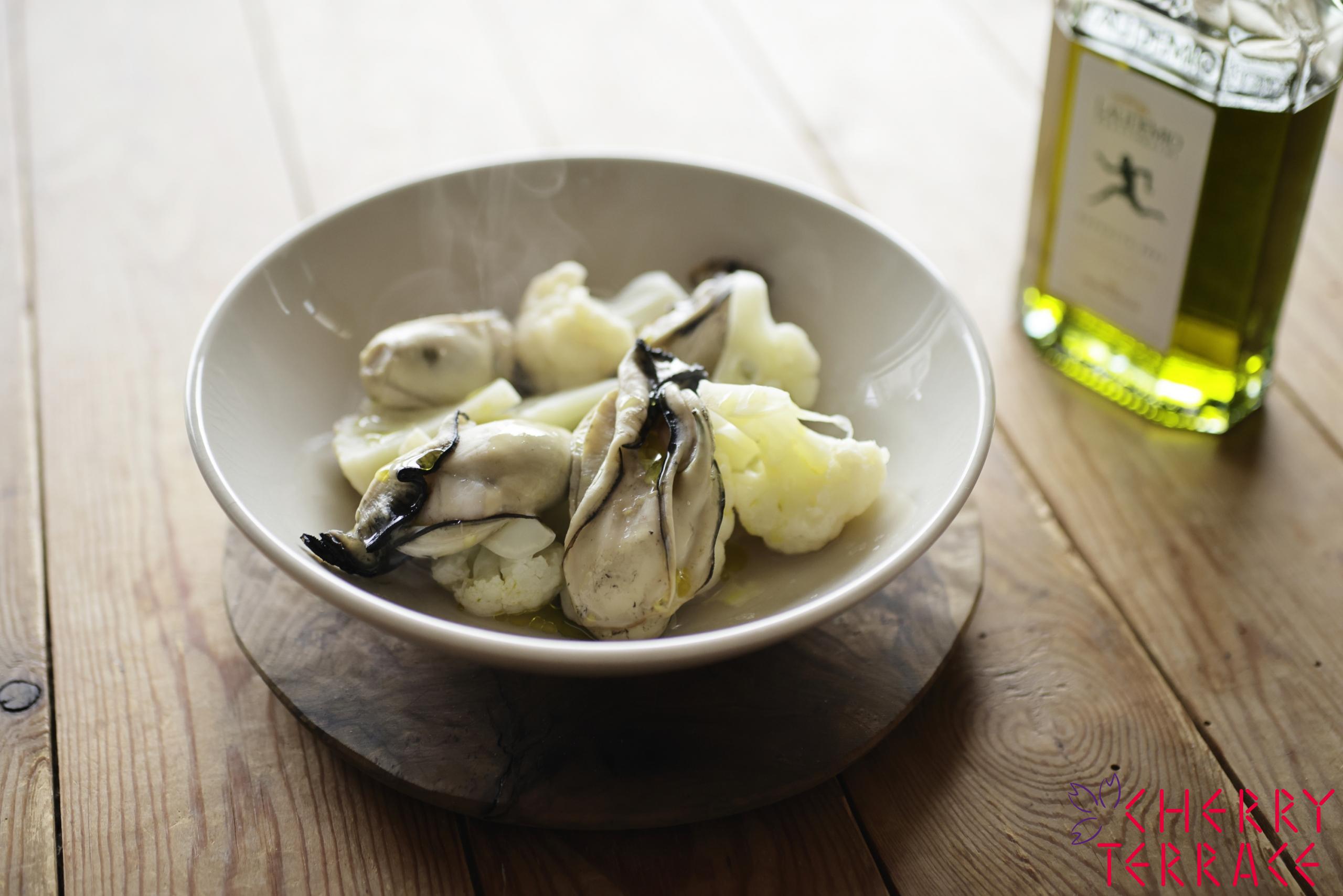 あらかじめ蒸したカリフラワーと一緒に、牡蠣をほんの数十秒蒸し、仕上げにヌォヴォ・ラッコルトをたっぷりまわしかけます。オイルの香りと、美しいグリーンの色が堪能できる一品です。