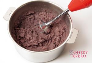 - 湯を捨て、豆だけ鍋に戻す(多少水気を戻しておく)。バーミックス(ミンサー)を差し入れ、よくつぶす。