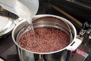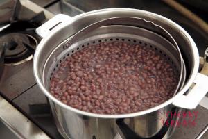 - 鍋に水800ccを入れ、バスケットに入ったあずきを戻し入れて中火にかけ、沸騰後少しずつ差し水をしながら小豆のしわが伸びるまで煮る。