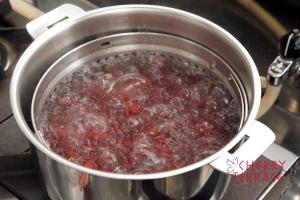 - 鍋に水850ccを入れ、バスケットを戻し、中火にかけ、沸騰してきたら中弱火に落とす。ふたをして小豆が軽く踊るくらいの火加減で40〜60分煮る。その間少量の差し水(3回程度)をする。