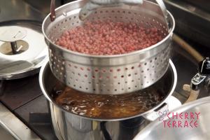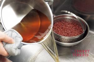 - 再び沸騰したら、そのまま2分以上煮て火を止め、バスケットごと引き上げ湯を捨て、あずきをサッと水洗いする。