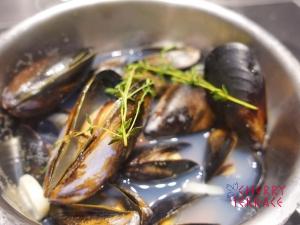 - ムール貝は水300mlでタイムと一緒に煮る。ムール貝の口が開いたら火を止める。