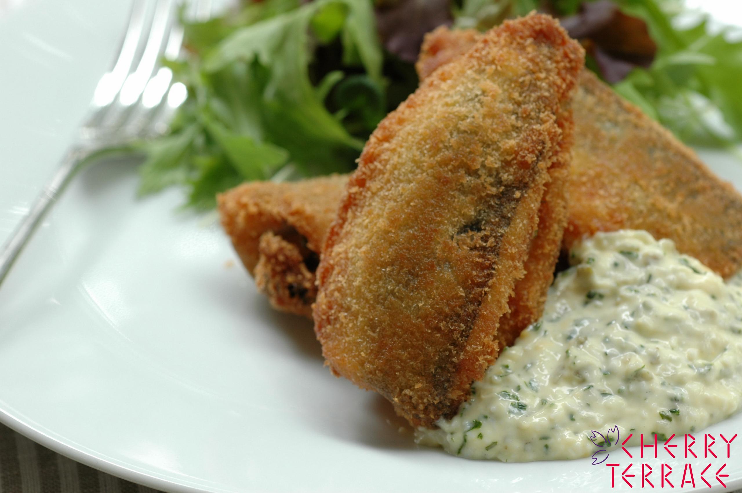 - 3に小麦粉、溶き卵、パン粉をつけて揚げ、タルタルソースを添える。