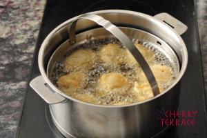 • クリステル深鍋クッキングバスケットをセットし、油を入れ、160℃〜170℃に熱し、4を大さじ1杯ほどすくい入れこんがりと揚げる。