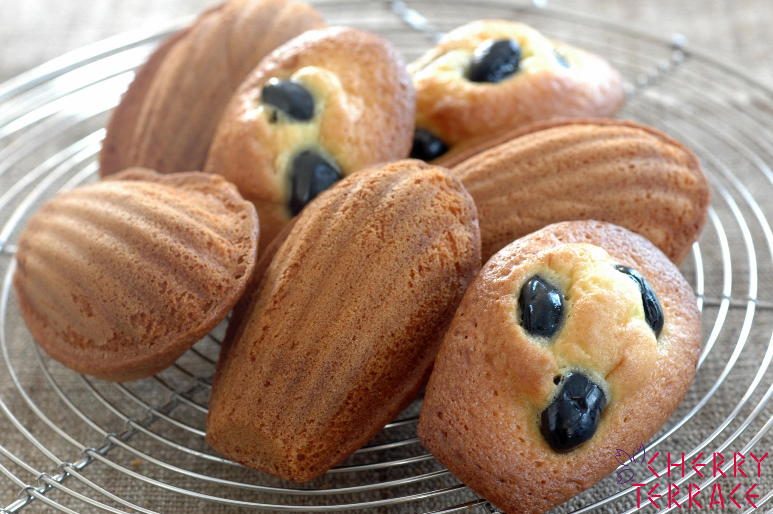 黒豆の甘煮入りマドレーヌ。生地はバーミックス(スライシー/チョッピングナイフ)で材料をどんどん混ぜるだけ。ハチミツ入りの風味よい生地に、黒豆の甘煮がさらにコクを加えます。