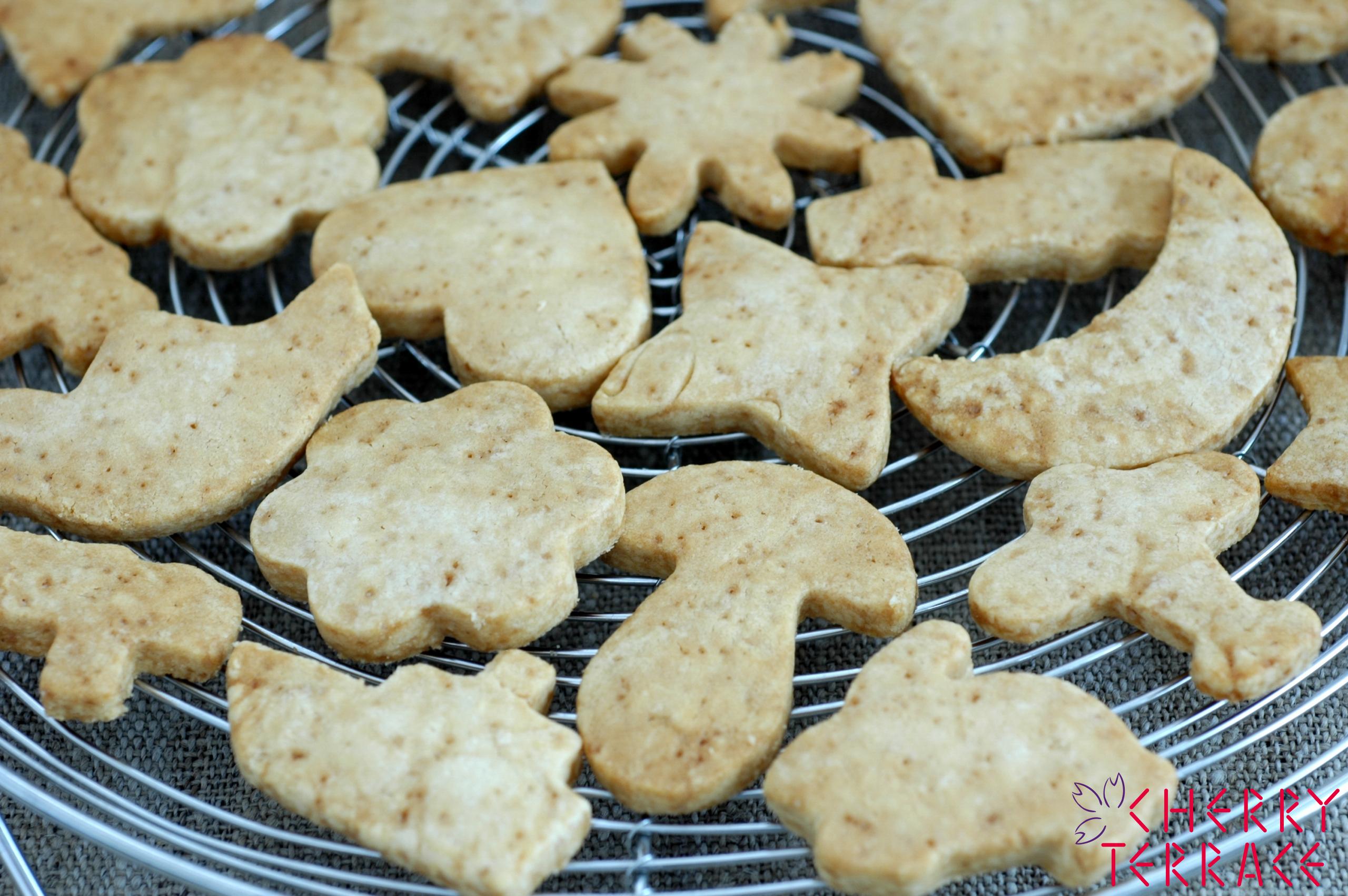 - ラップにはさんで3mm厚さにめん棒でのばす。好みの型でぬき、オーブンシートを敷いた天板に並べる。160℃のオーブンで30分焼く。