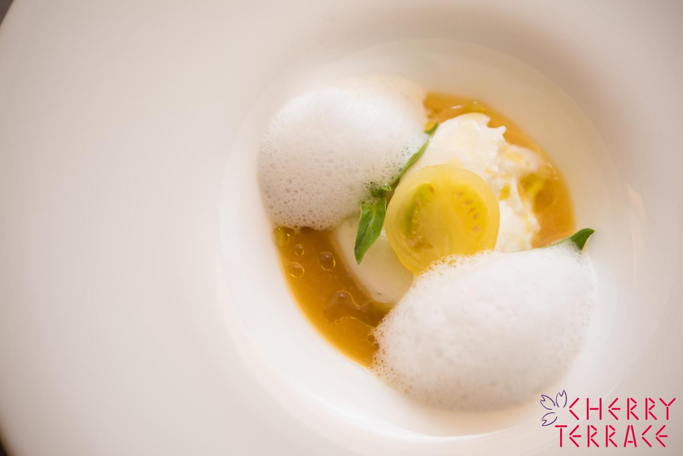 - 窪んだ皿に黄色いトマトのスープを流し、モッツァレラ、キューリのアイス、バジルの葉、オリーブオイルをかけ最後に5のトマトの泡をのせる。