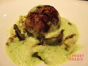 縮緬キャベツと黒アワビ茸を皿に盛り、ジャンボマッシュルームのファルシを置いて、ソースマデラをかけ、最後に根セロリとイタリアンパセリのムースリーヌを纏わせるようにかけて、すぐにサーヴする。
