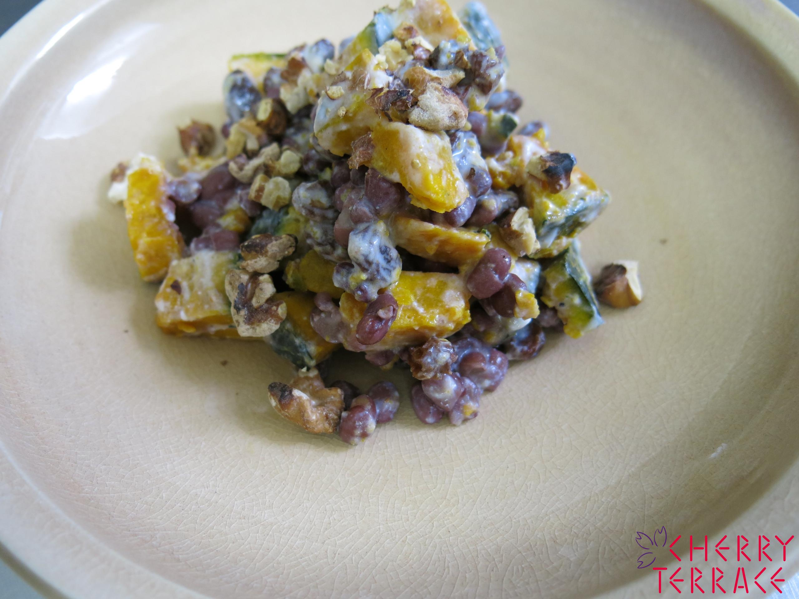- ボウルにかぼちゃ、小豆、くるみ、干しぶどうを入れ、Aを加えてよく混ぜる。