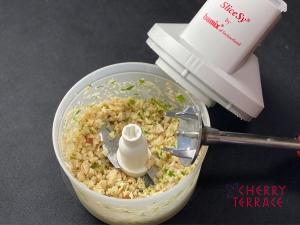 - バーミックス(スライシー/チョッピングナイフ)に、れんこん、しいたけの石突、パン粉、ハーブ、ラウデミオ、塩こしょうを入れて撹拌する。