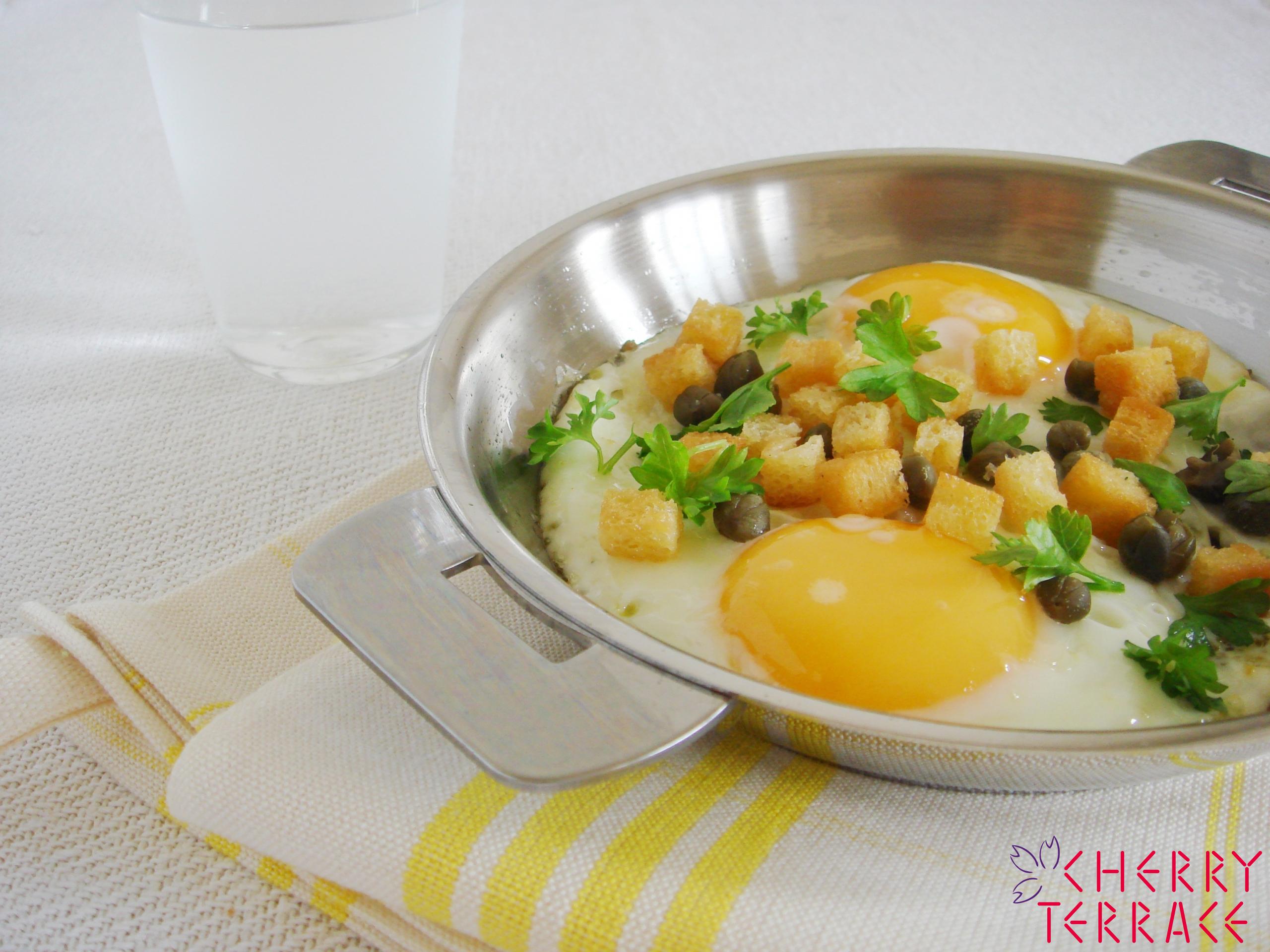卵好きにはたまらない美味しいオードブル。バターやラウデミオで炒めたクルトンとケッパーの酸味が効いた目玉焼きです。
