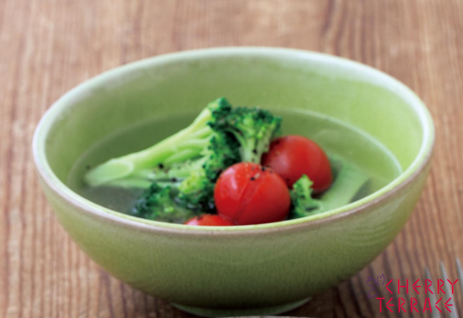 • クリステル深鍋にスープを入れ火にかけ、煮立ったらブロッコリー、プチトマトを加え、塩、こしょうで味を調える。