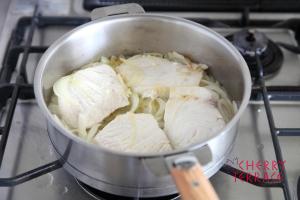 メカジキは、玉ねぎ、長芋と一緒に鍋に入れ、表面に焼き目がつくまでさっと焼き、臭みをとってからオーブンへ。