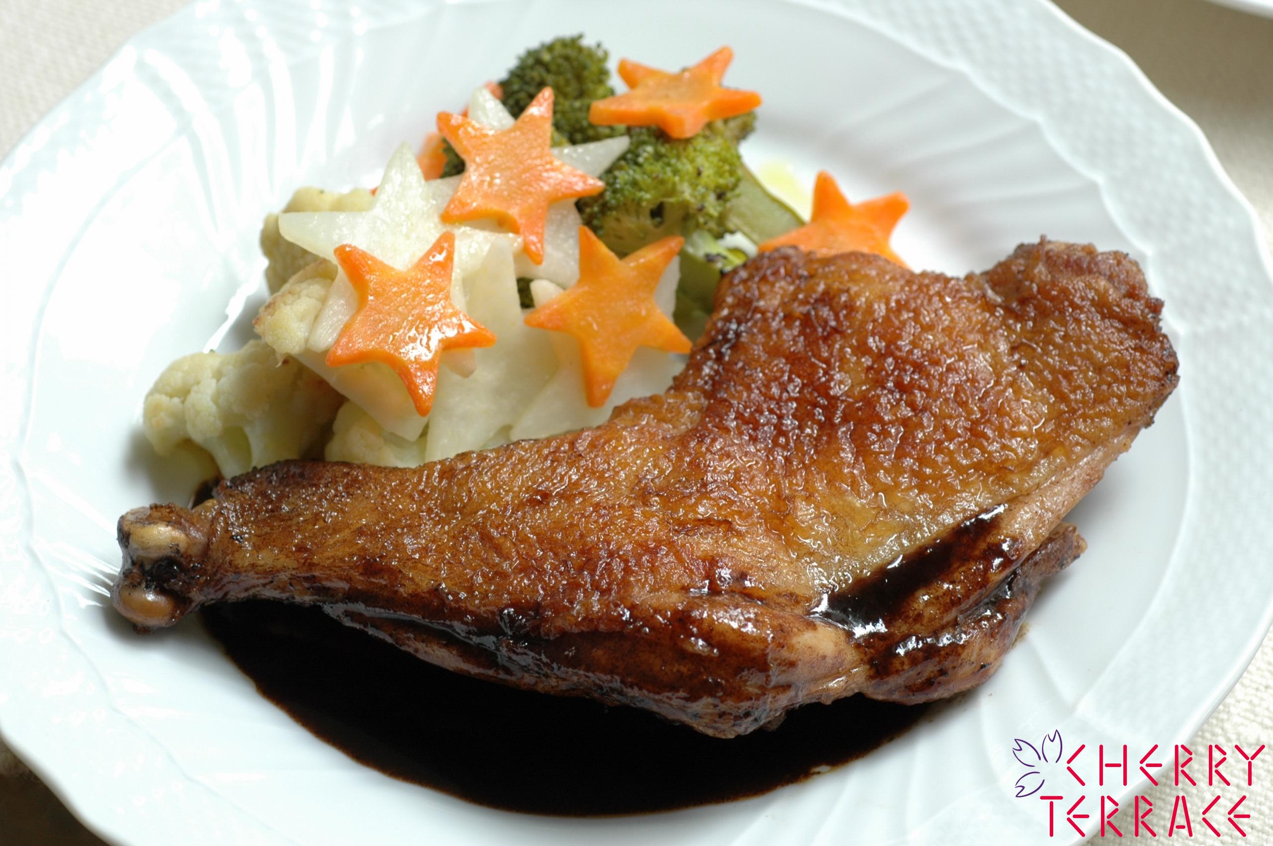 骨付き鶏もも肉を簡単に本格的な味わいに。バルサモ・ディヴィーノ(バルサミコ酢)を使った甘酸っぱいソースが大人にも子どもにも大人気。たっぷりの野菜を添えて、クリスマスにもおすすめです。