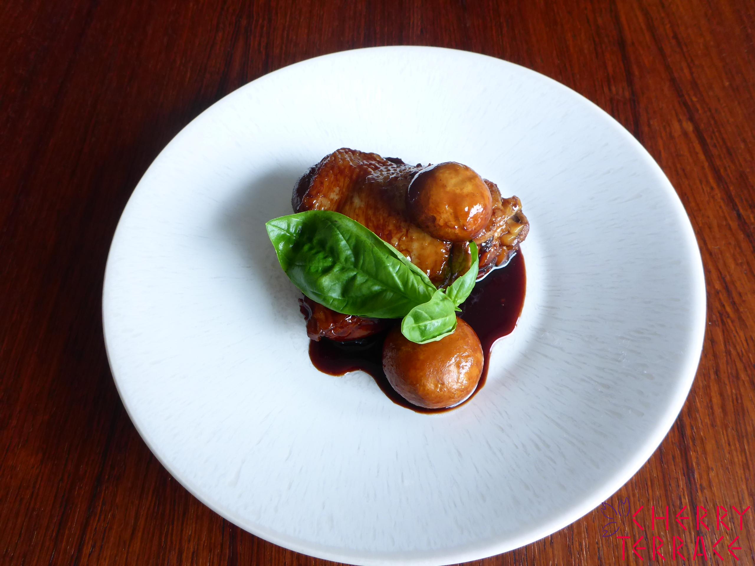 - 鍋にラウデミオ、にんにくを入れ弱火にかけ、色づけ、ディヴィーノ、酢、しょうゆ、塩、1の鶏肉、マッシュルーム、しょうが、バジルの茎を入れてふたをして沸騰したら弱火にし、20分くらい煮て、ホットキルト(保温カバー)に入れる。