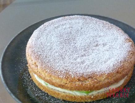 - 4のケーキを鍋から出し、2枚にスライスして、6のバナナのバタークリームと好みのフルーツをはさむ(今回はキウイ)。