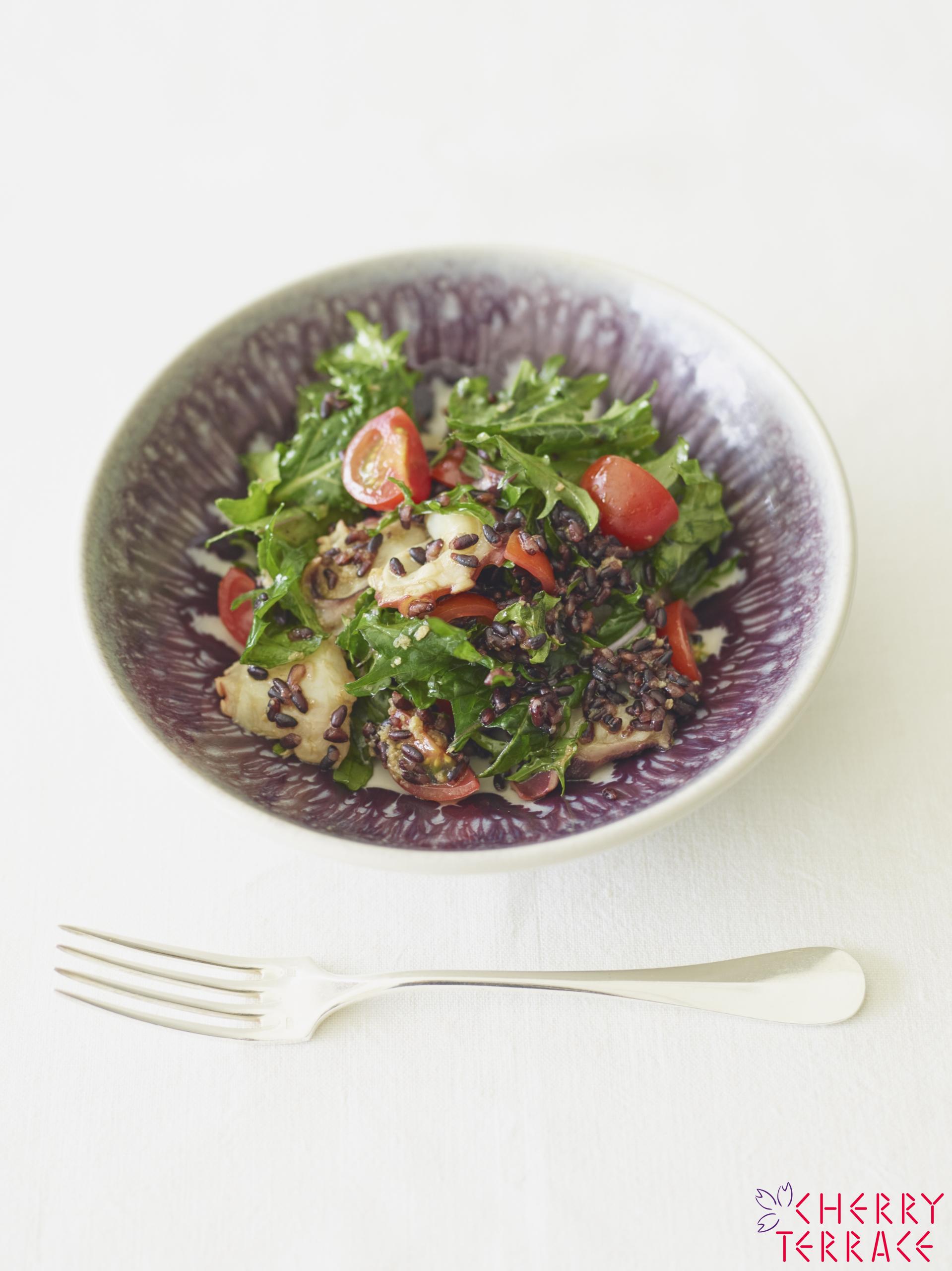 - ボウルにベビーケール、たこ、ミニトマト、黒米を入れ、ラウデミオをまわしかけてから、しょうが、ディヴィーノ、粗塩を加えてざっと混ぜ合わせる。