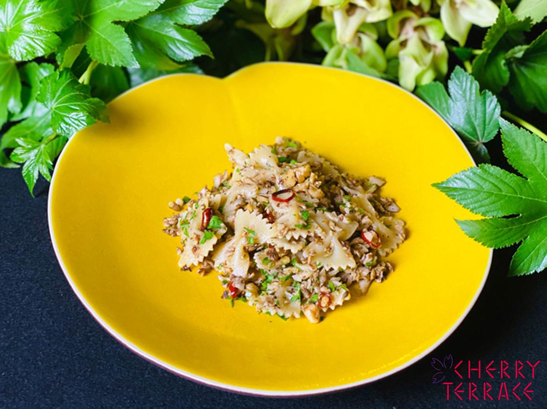 - クリステルフライパンにラウデミオを入れて、にんにくの断面を下にして中火にかけて、香りが立ってきたら、キノコを入れてキノコがしんなりするまで炒める。ナッツと鷹の目を入れてさらに炒めて塩胡椒する。パスタと絡めるので塩胡椒は強めにすると良いです。
