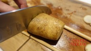 - 新じゃがいもをきれいに洗い、3mm幅くらいに切り込みを入れる(下まで切り落としてしまわないように菜箸等を下に置いて切る)。