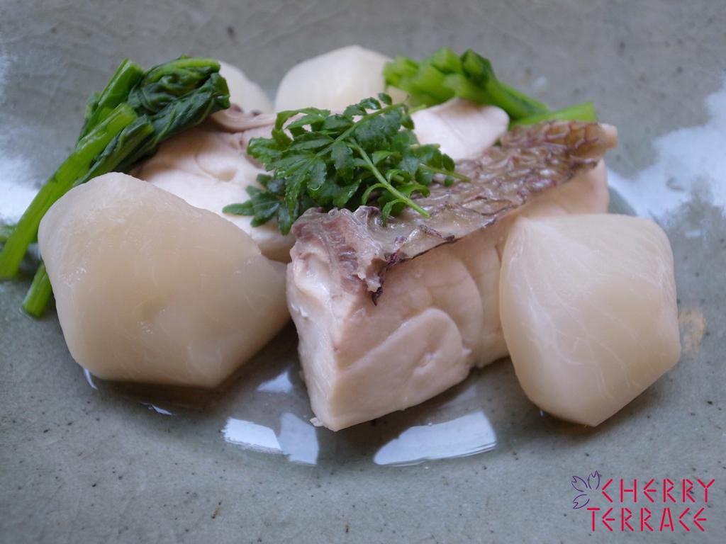- 4の鯛とかぶを器に盛り付け、木ノ芽を添える。