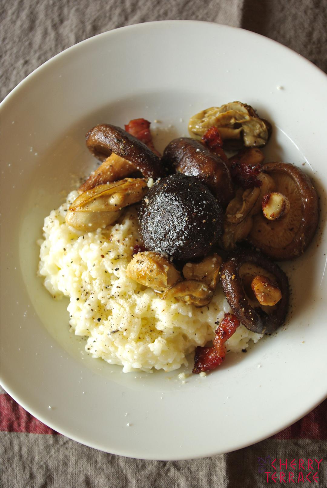 しいたけと牡蠣のソテーが主役なので、リゾットは炊いたご飯を使ったインスタントなリゾット風チーズライスです。