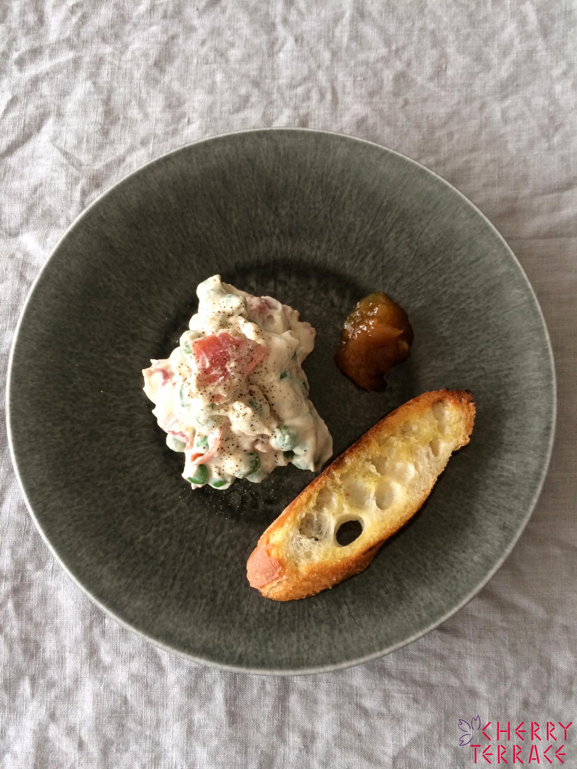 - 2とグリンピース、生ハムを和える。黒こしょうを挽く。ラウデミオで焼いたバゲットとオレンジマーマレードを添える。